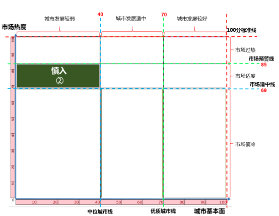 该区域城市基本面较弱,市场热度较低,房地产市场整体处于平淡期,风险偏小,在某些细分市场如高端市场,存在一定市场需求;需要通过审慎挑选高性价比的优质项目实现城市进驻。