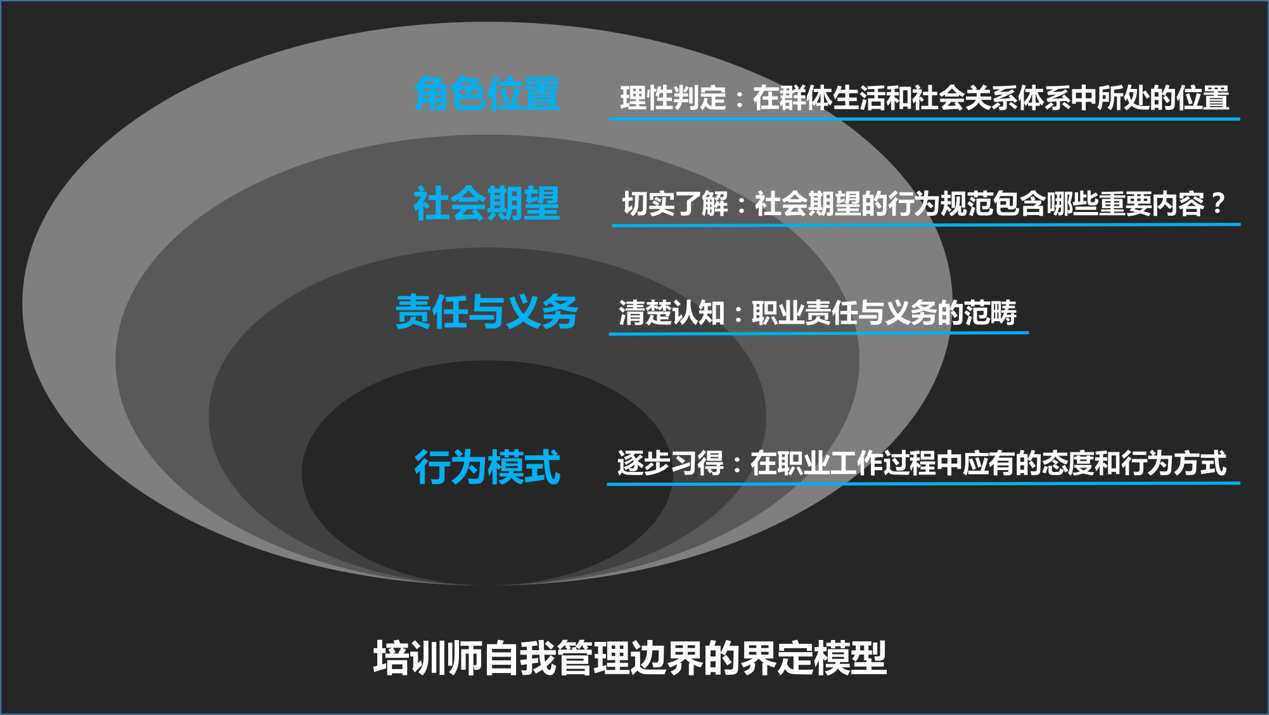 如果说通过前面的阐述,基本表达清楚了“自我管理对于培训师职业成长与发展具有非常重要的作用和价值”这一观点,那么接下来需要思考的是,到底什么是培训师自我管理边界的界定尺度?为什么需要以此为尺度对自我管理边界进行界定?