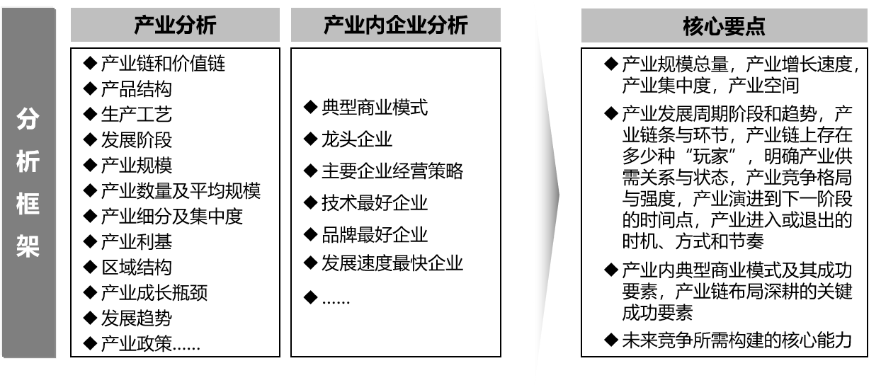 产业是具有某种同类属性经济活动的集合或系统。为了满足不同需要,可以根据产业的某些相同或相似特征将企业的各种不同的经济活动进行分解和组合进行产业分类。产业环境是指对处于同一产业内的组织都会发生影响的环境因素。包括产业规模、产业状况、竞争状况、生产状况、产业布局、市场供求情况、产业政策、产业壁垒和进入障碍、产业发展前景、产业中竞争的核心资源和关键成功要素、产业生命周期的转移方向等。产业环境分析的目的是预测产业发展趋势、判断关键竞争要素、揭示产业竞争格局、识别利润和发现利润区、明确投资时机和切入点。如图4-37所示。