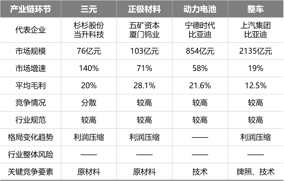 产业地图一般包含产业链环节、代表企业、市场规模、市场增速、平均毛利、竞争情况、行业规范、格局变化趋势、产业整体风险、关键竞争要素等。用于明确企业所处的产业赛道、识别竞争对手、合作伙伴、识别竞争制高点、洞察潜在的市场机会,以及制定和调整竞争策略。如表4-10所示。