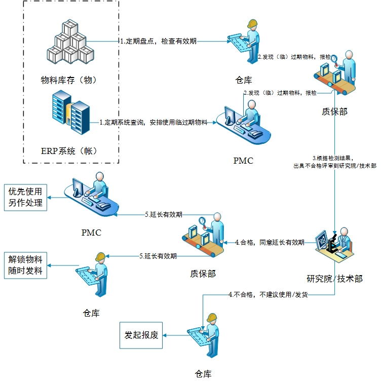 从仓库的一般流程来看,需结合仓库使用的系统来进行,比如呆滞品的管理。物料一般都具有保质期,在大规模采购/生产之后,有时遇到市场环境或客户需求变化而引发产品滞销,部分在仓物料会变成呆滞物料,乃至超过保质期,变成纯粹的过期不合格物料。因此,仓库自身可以对库存进行“健康度”管理,定期盘点梳理库存较久的物料/成品,向生产计划人员或销售人员反馈清单,推动处理。对于库存超保质期的不合格品,可以有一套超期重检程序进行管控。IT设置物料的库龄(在库时间)超过其保质期的90%时,将该物料的底纹标记为黄色;作为预警,设置超保质期的物料底纹为红色并品质状态变为不合格。生产计划人员定期巡视账务系统的物料超期信息,筛选出黄色底纹的物料。定期整理出需重检物料的表格,报检通知QC执行取样检测。研发技术人员则根据品质结果,判断该物料的使用方向(延长保质期、返工混掺、报废处理)。另外,还可以通过系统对此类物料的“特别处理”做好记录,并且可以通过系统查询到此物料的去处,对相对应的成品进行溯源。