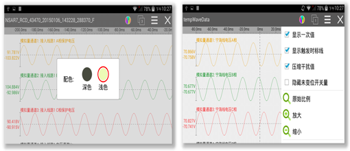 5、故障录波分析需求:在移动终端上可以打开故障录波文件(.cfg/.dat/.hdr),并可以根据需要选择显示一次值或二次值,采用时标线对同一个时刻的有效值进行比对,显示触发时标线等,提高故障分析和处置效率(见图8-9)。