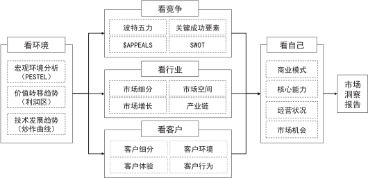 另外,在使用“五看”方法进行市场洞察时,也存在一定的顺序。首先,通过“看环境”分析宏观环境、价值转移趋势、技术发展趋势等,确定企业大致的目标方向。其次,通过“看行业、看客户、看竞争”初步论证大致的目标方向是否可行,明确企业的主航道。最后,通过“看自己”分析企业的市场机会,得出初步的市场洞察总体结论。具体如图 2-6 所示。