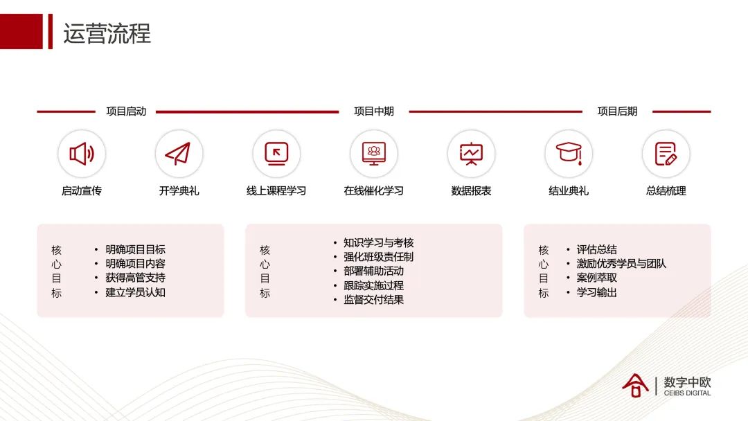以数字中欧的运营流程为例,它将混合式学习项目的整体运营流程分为启动、中期、后期三个阶段。在每个阶段,我们都设立了核心目标。如图11-2所示。
