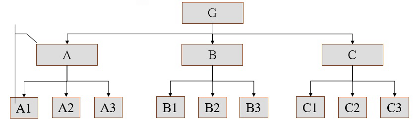 纵向结构,简单理解,从上到下的结构,由上图所示,从G到A-B-C,从A到A1-A2-A3,上下之间是从属或者包含被包含的关系。比如抛出一个中心观点,然后展开进行论述。