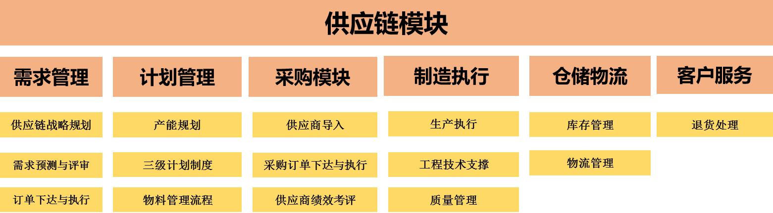 通过对业务模型的分析,供应链的业务模块由六大部分组成,分别是客户的销售需求、内部的计划、采购、制造、物流及一部分的客户服务(退货)。这些业务组成了供应链模块的日常业务,要对这些业务进行分析、总结、提炼,才能整理成合适的业务架构。