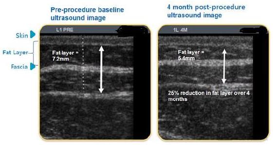 Venus Freeze™该技术是获得美国FDA批准的非手术复位技术,该技术无痛、不出血、不留疤、无恢复期,并且能让患者或患者体验到温和且温暖的按摩感。某患者为期4个月治疗前后的脂肪层厚度由7.2mm下降为5.4mm(如下图所示)。