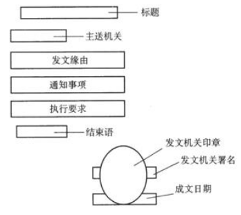 通知由标题、主送机关、主体、结束语、落款五部分组成。其中主体包括发文缘由、通知事项和执行要求。落款包括发文机关署名、成文日期、发文机关印章。