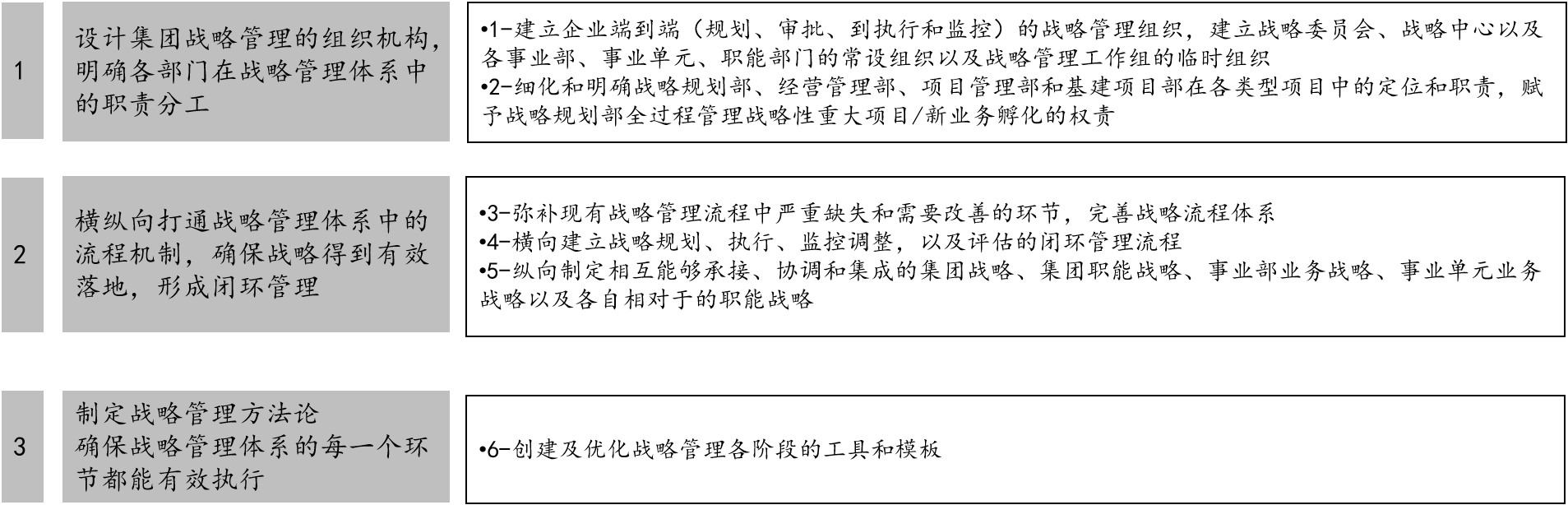 具体工作包括以下:围绕战略的规划、战略执行的跟踪与监控、战略执行的评估和调整,设计战略管理体系的组织结构和流程机制,以及相应的方法论工具和模板。
