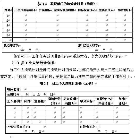 员工个人绩效计划是部门绩效计划的分解,由部门负责人与员工经过沟通后协商制定。当遇到工作难以量化时,要把重点精力放在当期内要完成的工作任务上。