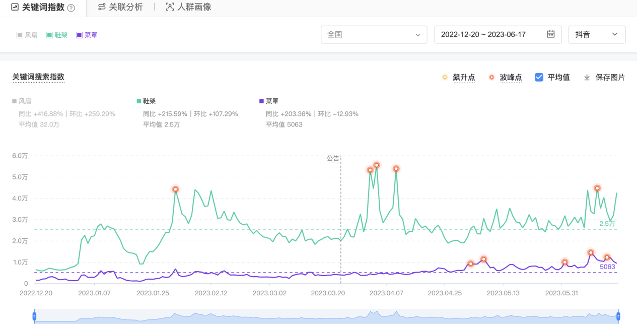 进入抖音巨量算数,通过比价3款商品的关键词进行搜索趋势分析,如图7.3所示,调出近半年的搜索趋势,风扇的增量和整体趋势是最好的,这个商品可选。