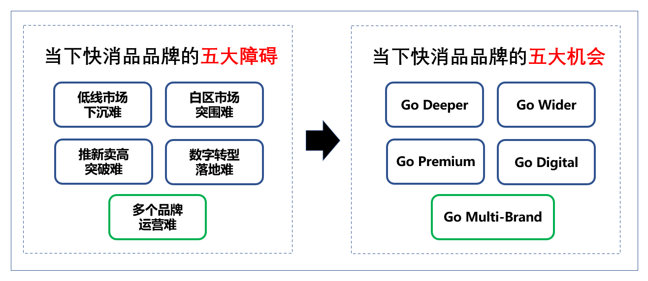 痛点和障碍其实不可怕,反而要把这些痛点障碍当成转机去运营去攻坚,五大障碍对应的五大机会分别就是:Go Deeper、Go Wider、Go Premium、Go Digital、Go Multi-Brand。如图1-2所示。
