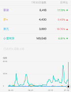 我们拒绝以偏概全,又做了天网搜索研究,发现茶派的日均搜索量是小茗同学的1.3倍。在微信指数方面,小茗同学则是茶派指数(茶派和茶π双词汇之和)的1.5倍,这是茶π词汇不好拼写和识别造成的遗憾,不利于品牌词汇的传播。小茗同学是茶饮料小鲜肉的领军者,而茶π则是咄咄逼人的后起之秀。