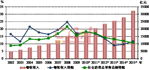 图1-1 中国餐饮业收入及增速(中国烹饪协会:《2015年中国餐饮市场分析报告》)