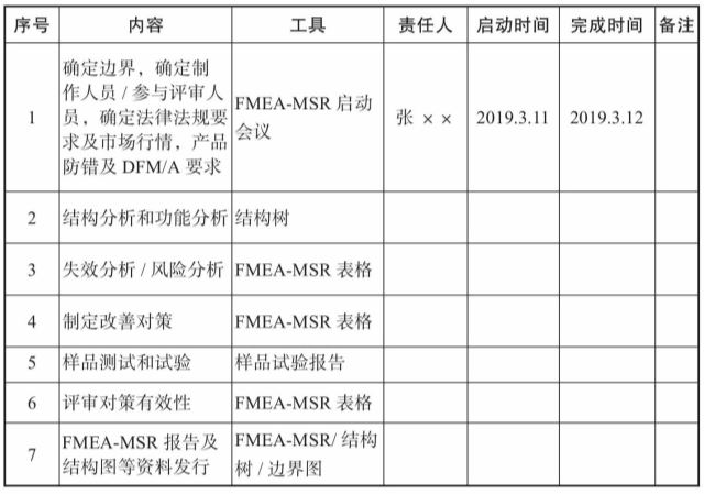 要解决三个问题:一是FMEA-MSR计划,二是分析的边界,三是填写FMEA-MSR的表头。FMEA-MSR项目工作计划就是要解决5T的问题,以下案例是模板。