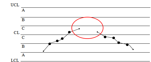 4.3 SL/CL:规格中心线/过程中心线。这两条线不一定一样,可能会重合,也可能不重合,因为过程会偏倚。过程中心线表现实际生产的过程状态,而规格中心是理想的过程状态。如图4-1-2所示。