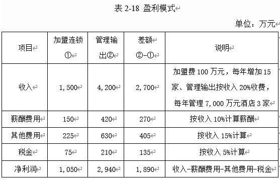 C酒店运营企业作为传统的酒店管理企业,面临着盈利模式的优化问题。通过对比分析加盟连锁与管理输出两种模式,我们发现管理输出模式在净利润方面更具优势。如表2-18所示。