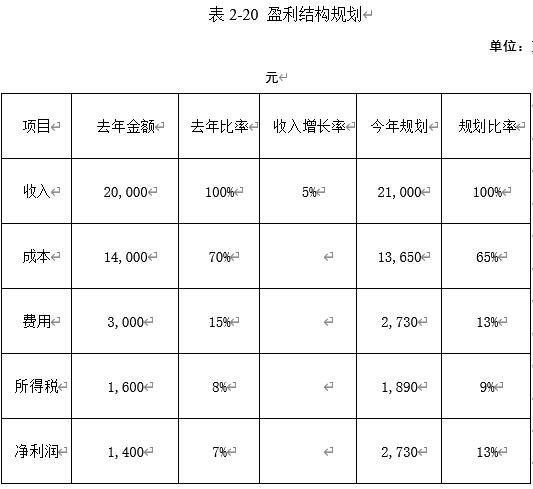 以某企业为例,去年该企业实现销售收入20,000万元,成本为14,000万元,费用为3,000万元,所得税为1,600万元,净利润为1,400万元,净利率为7%。今年,该企业规划实现销售收入增长率为5%,同时通过对成本、费用和所得税的合理控制,规划实现净利率为13%。根据规划,今年预计实现销售收入21,000万元,成本控制在13,650万元,费用控制在2,730万元,所得税预计为1,890万元,最终预计实现净利润为2,730万元,净利率提升至13%。如表2-20所示。