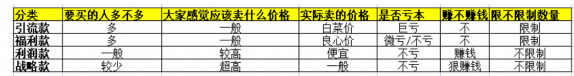 引流款一般与其他三款商品不能是替代关系,以免影响正常售卖。