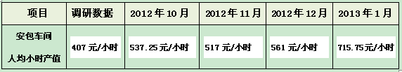 :我们看一下生产数据的变化:如表5-11所示,安包车间人均小时产值,由调研时的407元/小时/人,提升到2013年1月的715.75元/小时/人,效率提升很明显。月产量由2012年10月的169328件提升到2013年1月份的471529件。