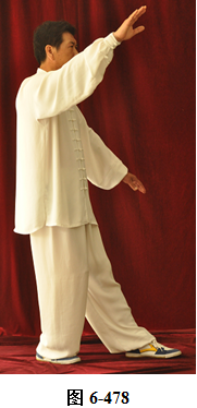 接上式,腰微拱,左右手翻转慢慢向右胯下捋,同时右脚跟落地;左腰随即左外上提,左手顺势左挒,身体随之转向面朝正东。右脚随左挒内转,脚尖朝东。右手内旋,手心朝上,左手搭在右手腕部;腰下沉,顺势两手向下打挤。同时左膝放松,左腰微提,随后微拱,左脚随腰向左前方迈出,脚掌虚着地面;右腰上提走弧形,右掌向前划圆,手掌翻转手心向下。左手随右手前送 顺势自然回放左膝外侧。身体随腰走弧线向前移动,重心前移左腿,呈左弓步, 眼神向下远视;腰回拱,重心随之移于右腿。右掌随腰回拱螺旋回收至小腹前;腰微含上提,右手慢慢翻转向上手心朝内,上抬高过头顶。腰向后转动,右手随之翻转向右外侧上方,手心朝前。左手心朝向地面,重心落在右腿上,呈后倚之式(见图6-470至6-478)。