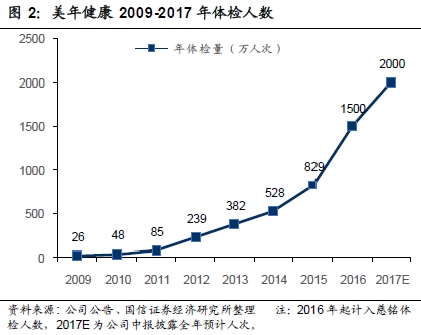 未来,美年健康的业绩就在于体检人数的增加和客单价的提升。公司预计2017年预计服务规模达到2000万人次、2019年目标4000万人次。如图6-20所示。