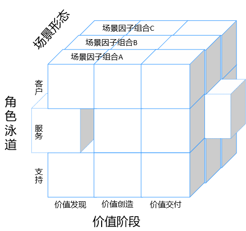 数字场景描述与分析的逻辑框架,对最核心的“事”作具象化解剖和变革性分析,把握关键角色视角的关键价值实际过程和形态,从而帮助我们更深入的理解和分析场景,是更加核心的“事”、“人”、“态”的组合。“事”指的是每个数字场景都是一个价值实现的过程,都具备场景价值流、价值阶段、价值项目、价值触点等,通过对此过程的分析,能够将场景以图表形式呈现出来;“人”指的是每个场景都有多方利益相关者参与,且基于不同角色视角产生价值实现泳道,需要首先选择核心的“人”,才能形成对应的“事”,其中,客户旅程是场景的重要角色泳道,每个场景都有其服务对象;“态”指的是场景以不同的场景形态实际的发生,每个场景都有关键的场景因子,场景因子变量的不同组合形成不同的场景形态,“态”的重要作用就是将不确定的“事”变成确定的可分析的“事”,场景形态关联具体流程,是挖掘变革机会的重要工具,如图3.2所示。