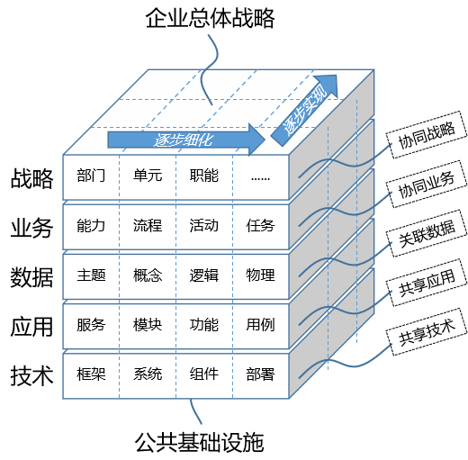 数字场景设计与建设的逻辑框架,是以更加具体的建设视角来认识场景,此视角贯穿战略、业务、数据、应用和技术,能够满足对场景开展设计和建设的需求。企业数字化转型多级架构要素在场景级建设中一以贯之,以保证数字场景作为衔接企业数字化转型战略和数字化系统实现的桥梁作用。企业数字化转型是一个复杂的系统工程,场景继承了复杂系统的基本要素,也突出了复杂系统中的逻辑和重点,既保留必要的系统性,又呈现特有的直观性。在此逻辑框架下,除了从战略到技术的逐层解析,还包括战略、业务、数据、应用和技术各自的逐步细化,以及从规划到建设、运营逐步实现的过程,是其可操作性所在。数字场景与企业总体战略、公共基础设施、相关场景要素紧密配合:场景战略要与企业总体战略对齐,继承目标和绩效;场景技术要尽可能匹配公共基础设施资源,避免重复建设和信息孤岛;本场景要与周边场景实现战略协同、业务协同,实现数据的互联互通和统一治理,实现能力共享、技术共享,如图3.3所示。