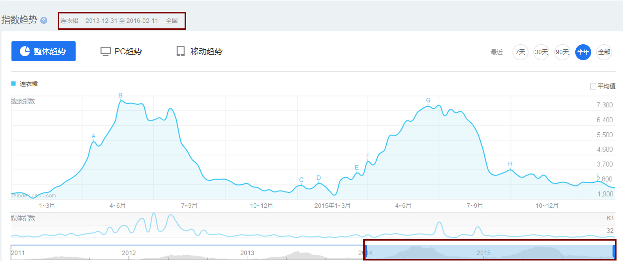 将这两个工具结合,分析出连衣裙这款宝贝在市场受欢迎的时间为每年的3月份到8月份,我们可以根据自己的计划制定宝贝上市时间表。