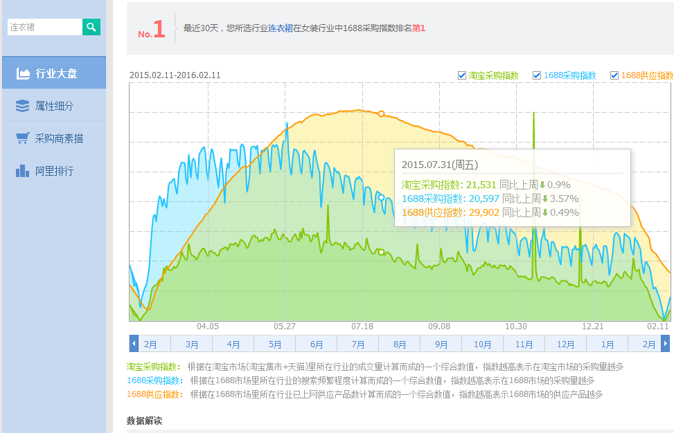 举个例子:我们要知道最近大家对连衣裙的喜好度到底怎样,那么我们就要先利用百度指数(http://index.baidu.com/)及阿里指数(http://index.1688.com)。以某店铺连衣裙为例,我们从中能得到哪些市场数据呢?如图1-8、图1-9所示。