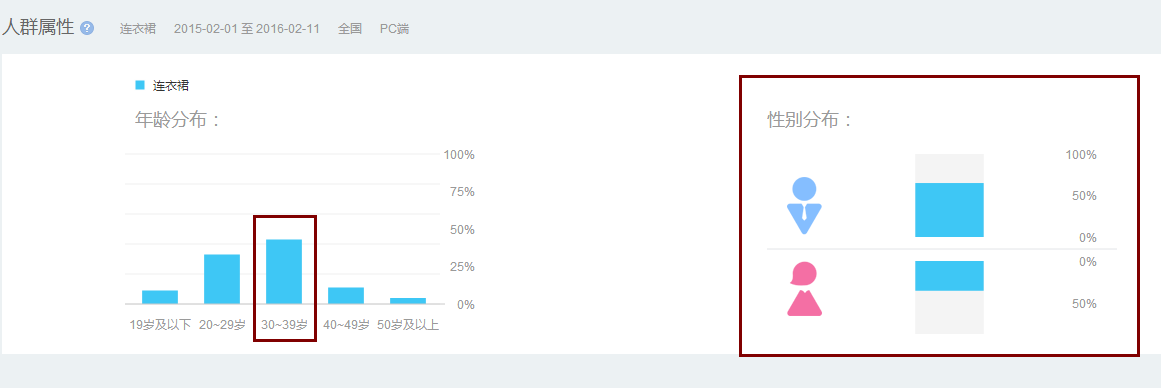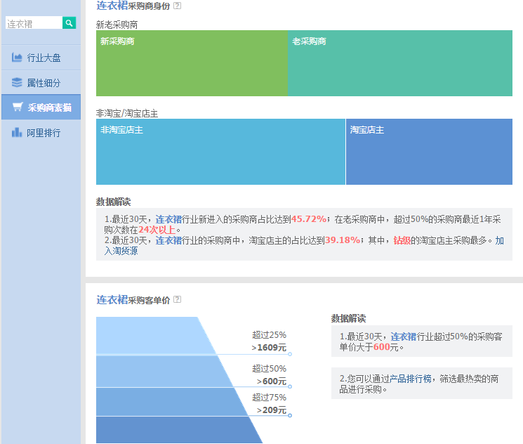 从图1-10、图1-11,我们可以看出:采购连衣裙的人群年龄层次在30~39岁之间,采购金额基本在209~600元。