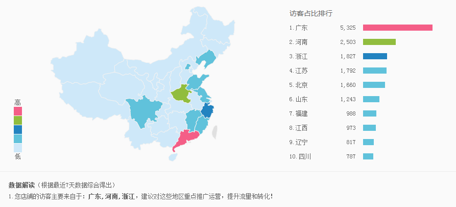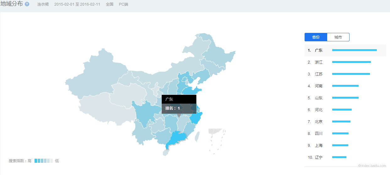 备注:图1-13所用数据为阿里巴巴1688后台的生意参谋数据,图1-12仍是百度指数。综合两个工具我们可以看出:连衣裙在全国最受欢迎的区域主要集中于广东、河南、浙江、江苏、山东、北京、辽宁、四川等地(注意:一定要结合两者的数据,其他行业或者宝贝均和连衣裙同理,本处主要是抛砖引玉)。