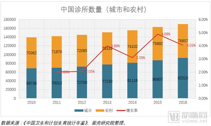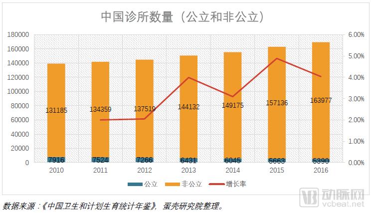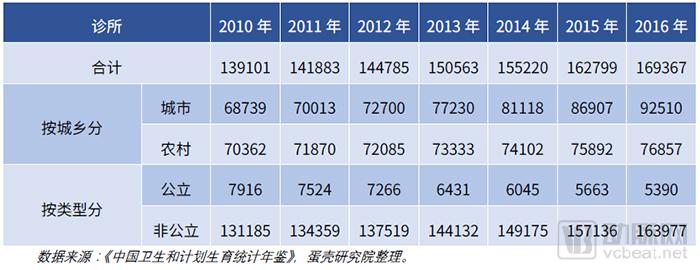 《中国卫生和计划生育统计年鉴2017》统计数据显示,2016年国内诊所已经达到了169367家。其中,城市诊所的增速远高于农村。2010-2016年这六年间,农村的诊所复合增长率仅有1.48%,而城市诊所的复合增长率为5.07%(图1-3)。