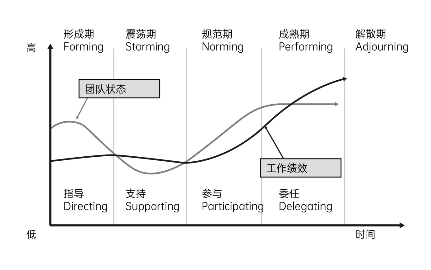 Bruce Tuckman将团队发展的阶段表述为形成阶段、震荡阶段、规范阶段和成熟阶段。后来Tuckman又增加了第五个阶段——解散阶段。如图6-11所示。