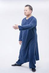 4.右脚涌泉一踩,将所有重量与重心慢慢移交给左脚。在移交重心的同时,双手反方向移动,左手臂掤出,向身体前方荡起至胸前三个拳头长的距离,右手由原来的胸前慢慢自然放下,手掌朝后,大拇指在裤腿缝处,中指微微翘起。脚停手停、手停脚停;一动无有不动、一静无有不静;此时上半身向着45度的东北方向,两手背自然保持美人手。