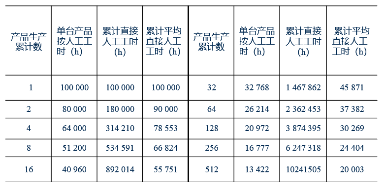 图1-15中是某飞机厂的飞机构架加工制造的学习曲线。表1-10中所列的就是和图1-15对应的相关数据。表中第1列表示产品的累计产量数,第2列表示与这个累计台数相应的单台产品直接人工工时。由于表中取得累计产量的关系都是增加一倍(翻一番),即累计产量为2n。这样单台(件)产品直接人工工时按20%递减的规律就清楚地显示出来。