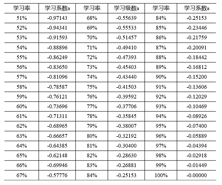 表1-11 学习率与学习系数对照表