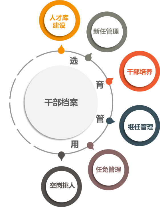 契合干部管理的核心流程,整合干部选、育、管、用等环节,打通各环节的数据运用。这不仅是干部管理的流程,也是关键人才管理的核心四大流程。