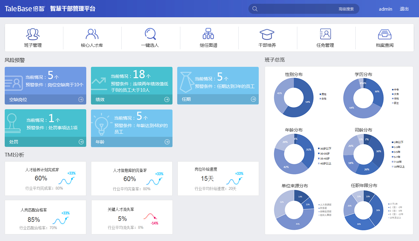 如图14-2的干部管理人才数据分析仪表盘,我们既可以通过一个综合的仪表盘了解公司的人员结构,比如性别、学历、年龄、司龄等。这是普通的E-HR软件就可以做到的,更重要的是我们可以通过系统软件进行班子管理、核心人才库管理、继任图谱管理等常用功能。这些信息以往都散落在各个部门各个文件里面,每当需要年度分析盘点的时候,需要人力资源部按照项目的形式,协调各个相关部门,打通期间的壁垒,费时费力,数据不一定准确。现在数据归集可以让上级领导在任何时候查阅相关信息。同时,系统还可以依据一定算法提出各类风险预警,比如关键岗位空岗预警、绩效连续低的预警等,能够实时把握干部的现状。