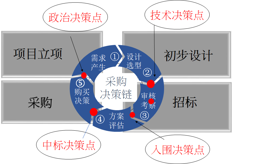 分析采购组织有5个模型:采购的决策流程、成员角色、立场、内部政治、影响力。采购的决策流程有四个关键节点:技术决策点、入围决策点、中标决策点、政治决策点。把握这些关键节点,对项目的成功至关重要。