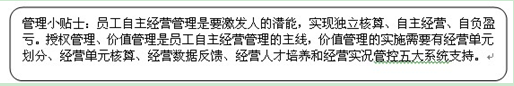 经营哲学是员工自主经营管理的基础,价值管理和授权管理是员工自主经营管理的主线。价值管理的实现需要相应管理系统来支撑,这个系统包括经营单元划分,价值创造核算,经营数据反馈,经营人才培养和经营实况管控。