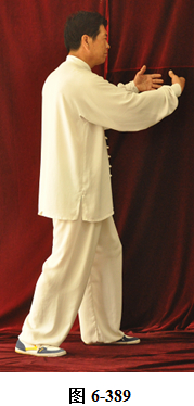接上式,腰微拱重心移落左腿,身体后倚,两臂随之向左胯下捋;腰向左微转,身体随之转向朝东北方向,两臂由捋随身转向东北方向圆撑;右腰微提,随之提右膝抬腿,向东北方向上步;左腰微提,左膝提起,左腿向左前迈进一步,面向东北,呈左弓步圆掤;腰微含重心移落右腿,随即腰上提,两臂随腰含上提之际,向里翻转外旋,左手经胸前向左上方弧形上掤,掌心翻转向外;右手外旋,掌心向外,重心落于左腿,呈左弓步;左手掌随腰上提向上架掤于左额前,右掌由胸前里旋翻向前推掌,眼神向前平视(见图6-388至6-390)。