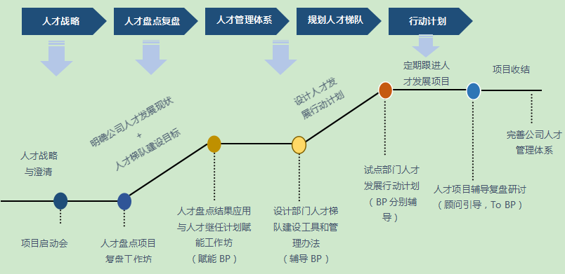 这个项目的周期是一年,伴随人才管理年度主要活动为一个循环,这样就可以有针对性地设计、执行和完善整个公司的人才管理体系。