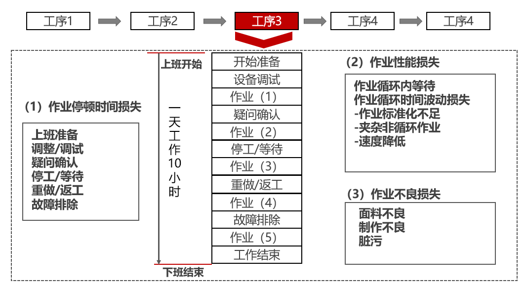 整个班组面辅料等待,作业员机器维修等待,上一道工序流入的等待。