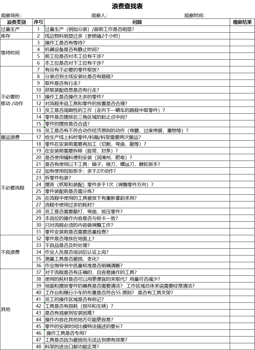 一般,在执行浪费识别表时,需要遵循以下4个原则进行操作: