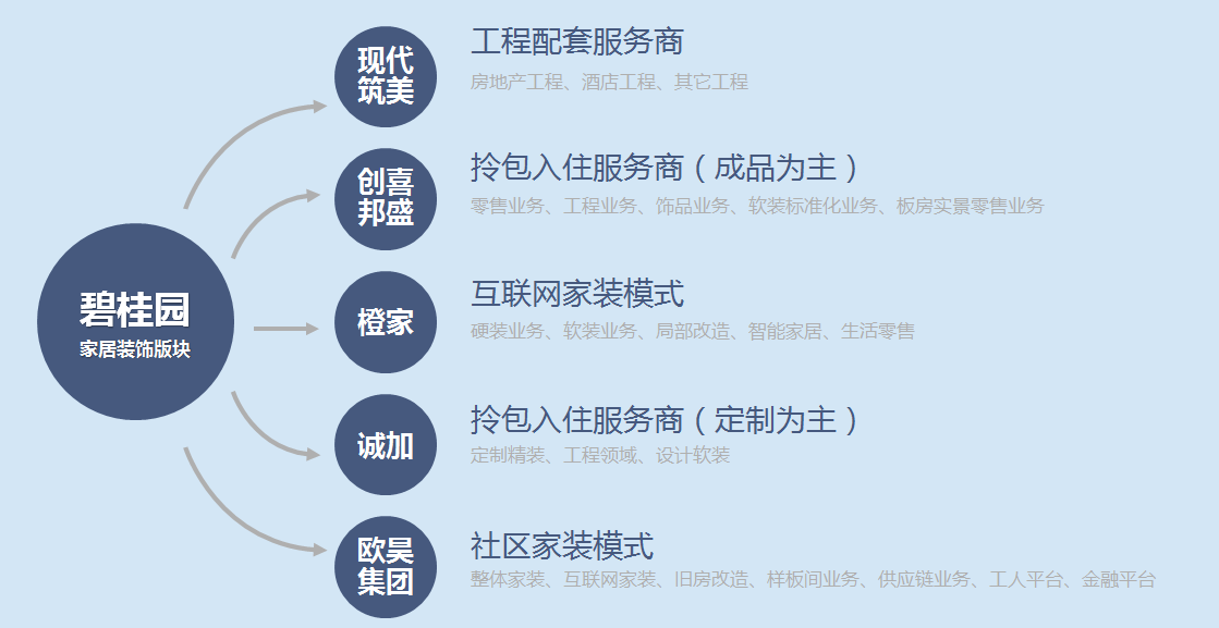 碧桂园集团在向家居产业延伸也进行着重大的布局,内部采取多头并进的方式开展各个领域的业务。在消化内部业务订单的同时,也同时向外部市场化的订单进行合作向市场化方向同步发展。