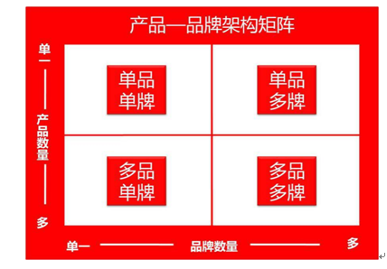 企业的产品战略就是产品架构规划的问题。根据企业的产品的数量和品牌数量的多少,得出一个“产品—品牌架构矩阵(如图3-1所示),分为单品单牌、多品单牌、单品多牌和多品多牌几种类型。