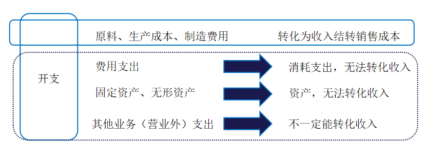 分类之后会发现,这些支出除了购买原料,用于生产加工的成本之外,要么最后是转化为资产了,要么是变成了消耗,最终几乎都不能转化成真正的收入。