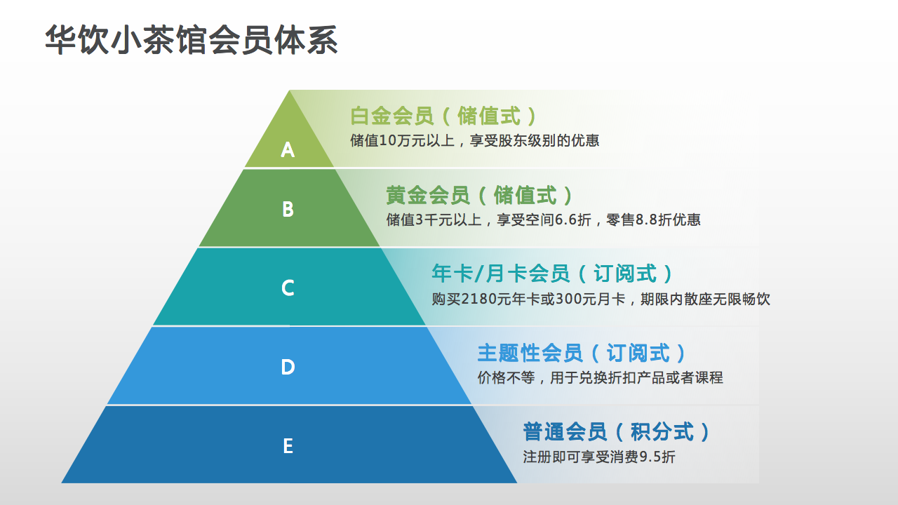 经过从1.0到4.0的发展,把水木华饮连锁茶馆目前形成的会员制矩阵用一个金字塔结构表达出来,是下面这样一张图: