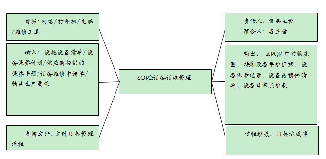 (5)设施设备管理乌龟图,此过程相关条款有:7.1.3基础设施,7.1.3.1工厂、设施和设备计划。